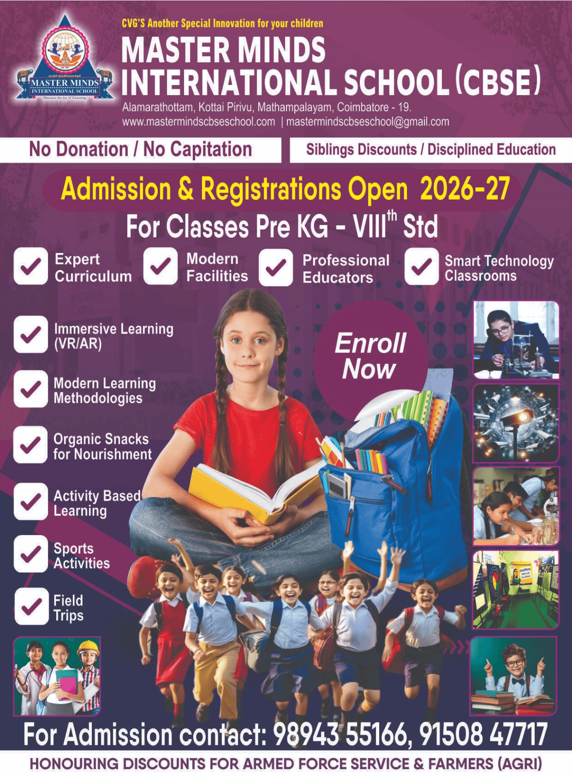 Master Minds International School, located in the vibrant city of Coimbatore, is a prestigious institution dedicated to providing quality education that transcends conventional boundaries. Founded by visionaries K. Selvam and R. Vengatesh under the auspices of Sri Raja Yoga Vidhya Ganapathy Educational Trust, the school is deeply
